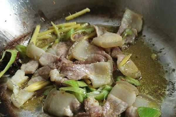 準備材料:白菜半棵,五花肉1塊,卷煎2條,蔥1段,薑2片,幹紅辣椒2個,醬油2勺,大豆油20克,鹽半勺