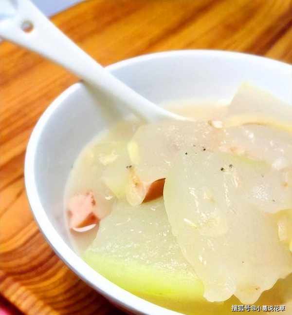 2.鍋燒熱,加入少許油,油熱後加入薑末爆香3、加入火腿丁翻炒幾下。4.加入切碎的冬瓜繼續翻炒半分鐘