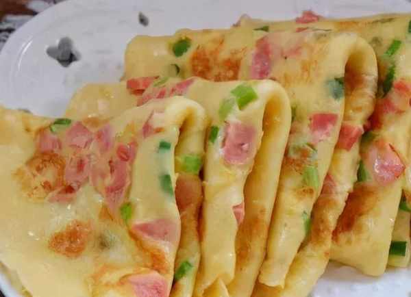 原料:牛奶240毫升,普通面粉100克,雞蛋4個,蔥花,火腿片。