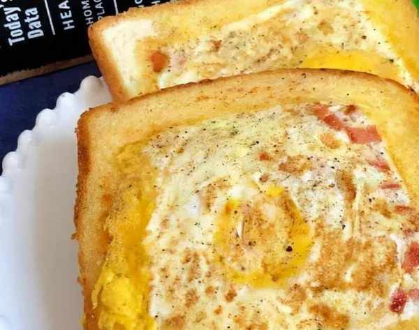 做法:1.吐司中間切一個方孔,火腿切丁