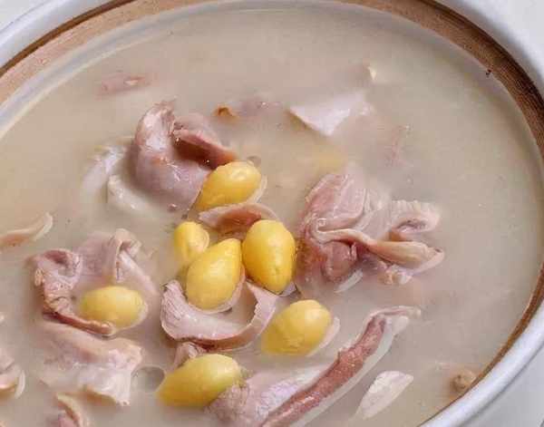 將切好的豬肉塊和雞肉塊放入鍋中,加入花椒塊和薑塊去腥,大火煮20分鐘,再轉小火慢燉2小時。加入白果和枸杞繼續煮一小時。