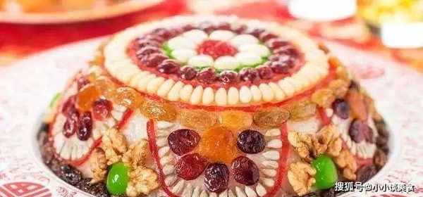 7、八寶蒸飯,蓋上盤子翻面。稍微冷卻後,將準備好的糖漿倒在上面即可食用。