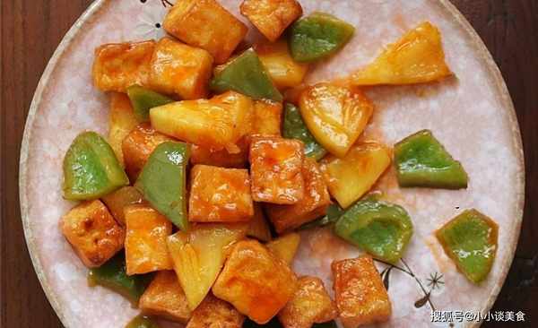 材料:硬豆腐1塊、黃梨1/4個、青椒1個、番茄醬3湯匙、糖1湯匙、鹽1/2茶匙、生粉1/2茶匙、水2湯匙