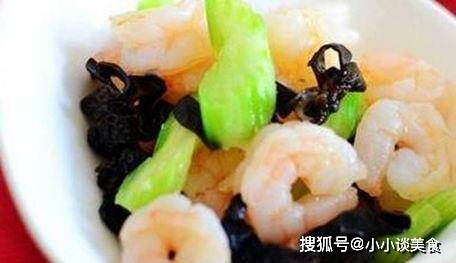 6.油燒熱,爆香蔥薑蒜,先加水把香菇炒黑,然後加入黃瓜片繼續翻炒,最後加入素蝦翻炒入味