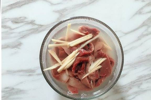 一、豬肝切薄片,加入少許鹽、料酒、薑絲,將其浸泡30分鐘後洗凈備用;
