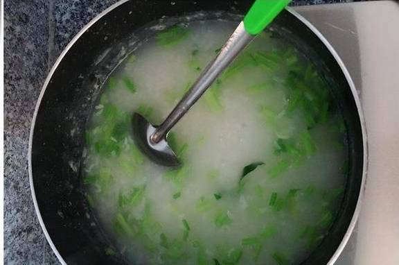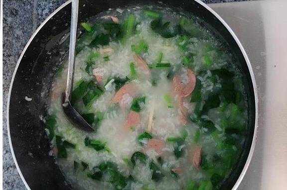 四、大米熬煮隻開花後,下菠菜根拌勻;