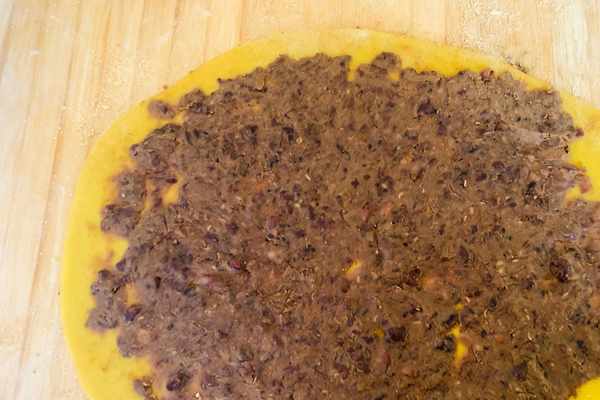 9、晾至稍微不燙手時多揉一揉,如果粘手可撒些黃豆粉,揉成團後搟薄,然後均勻地鋪上提前做好的紅豆沙。