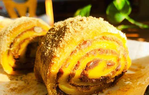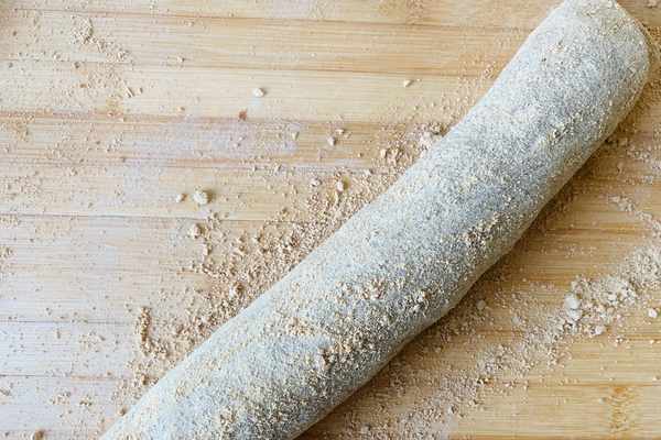 10、提起一邊向上卷起,卷到頭成筒狀,再滾上研磨好的黃豆粉。
