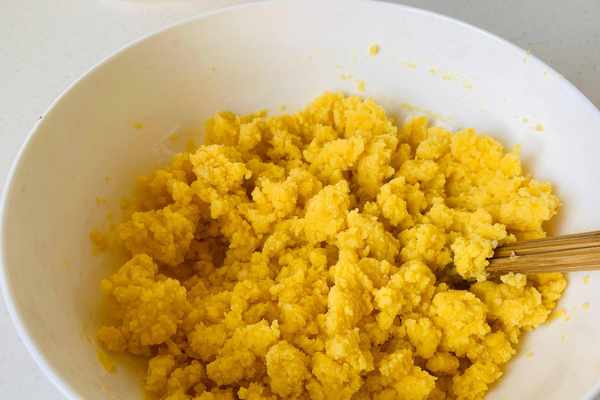 1、將細玉米面放入盆中,倒入滾開的水,邊倒邊攪拌至沒有幹粉狀態。如果和面時不摻玉米面,要將一部分黃米面像這樣用開水燙熟。