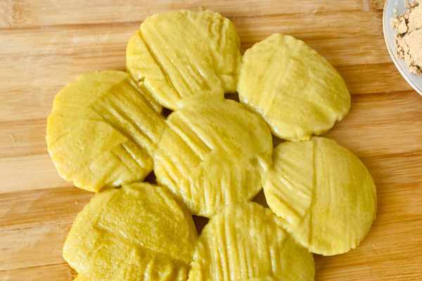 8、將蒸好的黃米面從鍋中取出,放在提前撒有黃豆粉的案板上。