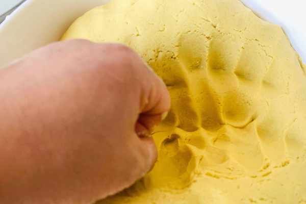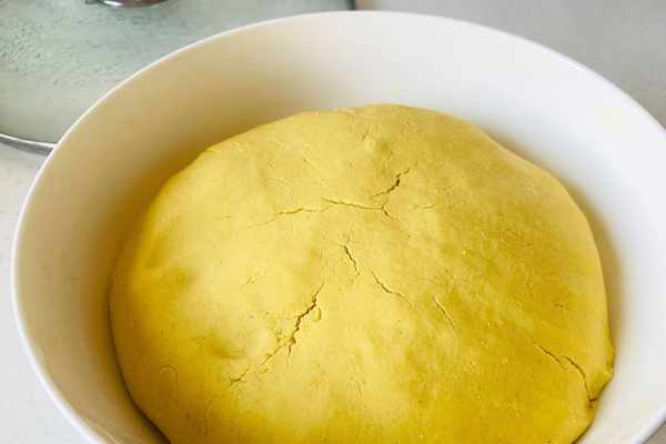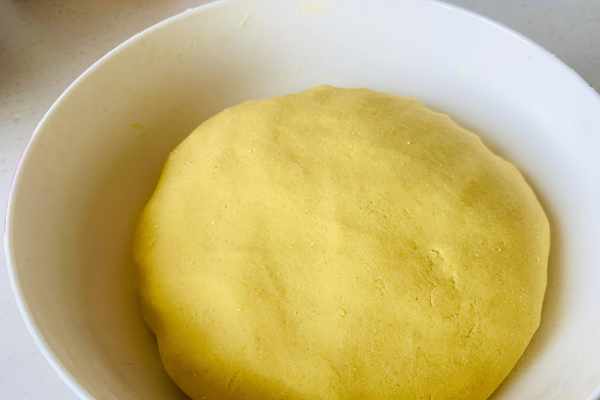2、在燙好的玉米面或黃米面中加入黃米面幹粉,和成稍微偏軟的面團,蓋上蓋子,放到溫暖的地方等待發酵。