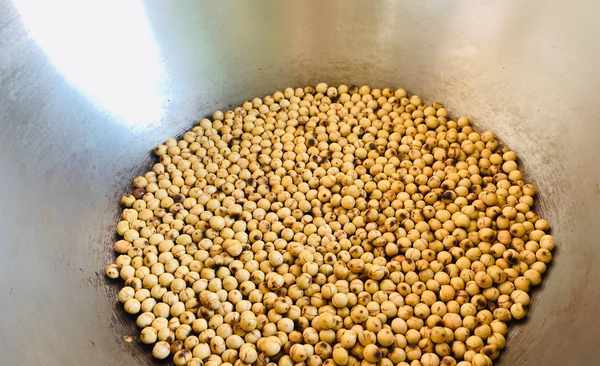 4、把黃豆洗幹凈後倒入炒鍋中,先開大火炒,等水分收幹時轉小火,用鏟子不停翻炒,防止炒糊,見黃豆全部裂開且有小糊點兒時,就說面炒熟瞭。