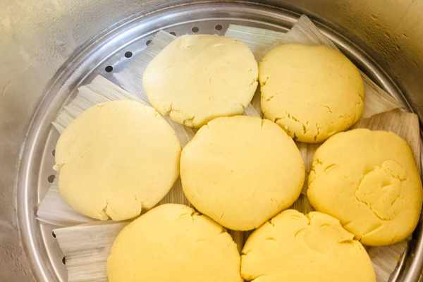 7、將揉揣好的黃米面團揪成小塊兒,擺在提前墊上防粘的玉米皮或蒸籠佈的蒸屜上,蒸鍋中加足水,水開後中火蒸十五分鐘即可關火,因為揪成小塊兒比整塊兒鋪上更透氣熟的快。
