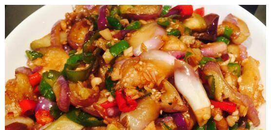 倒入茄子和紅辣椒翻炒,最後加少許雞粉調味,撒上蔥花;