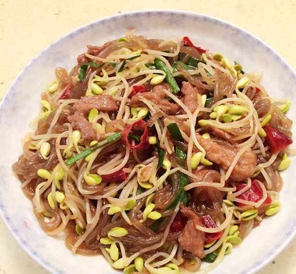 5、加入處理好的豆芽,加鹽3克,中火攪拌至豆芽破爛;