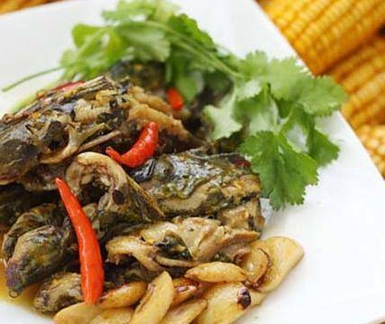 做法1燒熱花生油,將蒜瓣炸至金黃色。將炸好的蒜瓣瀝幹水分,加入胡椒粉和生薑炒香。加入黃骨魚,煎至兩面的粘液凝固,期間不經常翻動。2倒入炒好的蒜瓣和小米椒,加少許醬油、料酒、鹽和少許糖(提鮮)。加入淹沒在黃色魚苗中的水,煮沸。用小火慢燉,直到汁液蒸發。放在盤子裡,用香菜裝飾。