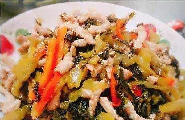 3、另取一油鍋,倒入酸菜炒香;加入肉絲炒勻,加少許糖調味。(酸菜本身有咸味,不需要另外加調料);最後加入磨碎的紅辣椒攪拌均勻;