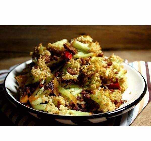 2、炒菜花的時候先把肥肉翻炒出油,比用色拉油炒的更香好吃。