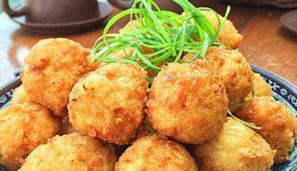 5、鍋內倒入油,將壓好的丸子順著鍋邊一個一個煎;待丸子稍稍成型後,用漏勺推入,均勻受熱,顏色更均勻。磁盤