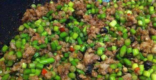 2.取出,瀝幹底部的小水!這一步很重要!這才是決定幹菜花香味的關鍵!鍋內放油,油熱後放入肉末,炒至變白。