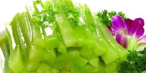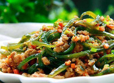 1、將幹海帶泡軟,切成細絲,用開水燙一下備用。