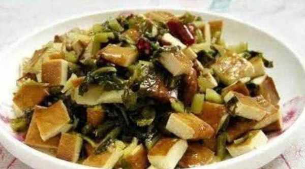 5、然後倒入酸菜和香幹丁,大火翻炒。