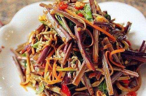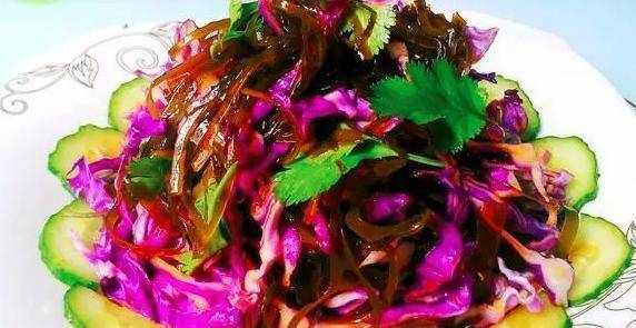 原料:幹海帶30克,黃瓜半條,紫甘藍2片,香油,香菜,醋,醬油,香油,香菜,醋,醬油。