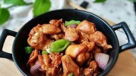 2、鍋中植物油燒熱,倒入雞塊邊變色邊炒,加入蔥蒜拌勻,放入香菇,加適量水炒熟。直到雞肉變軟並煮熟。