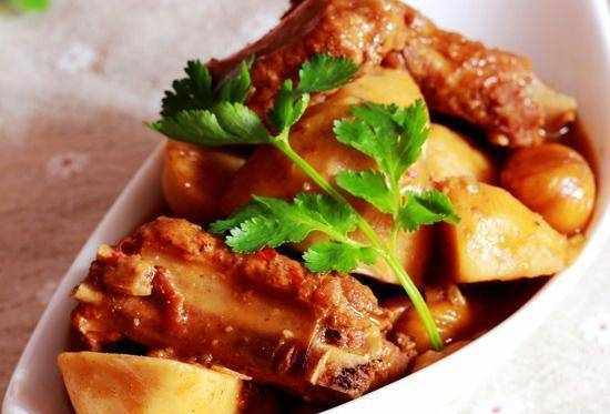 原料:芋頭600克,栗子200克,排骨400克,生薑1片,大蒜3瓣,洋蔥1片,油10克,花生醬8克,醬油5克。、鹽3克、料酒10克
