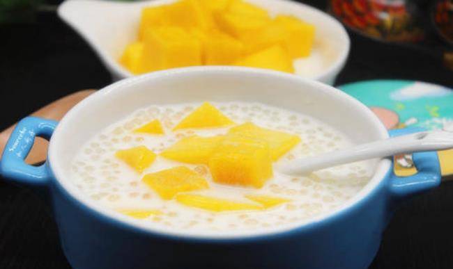 8.將西米、冰塊、芒果泥、芒果倒在盤底最後倒入冷卻好的椰漿。