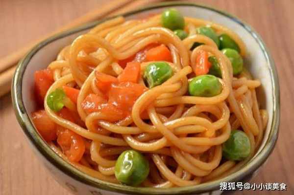 材料:面條、胡蘿卜、西紅柿、豌豆、番茄醬、醬油、素蠔油、醋