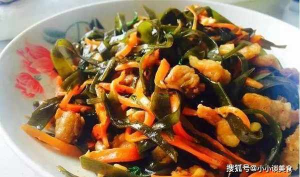 原料:海帶(先將海帶洗凈加水煮沸)、胡蘿卜、豬肉、薑、蔥。