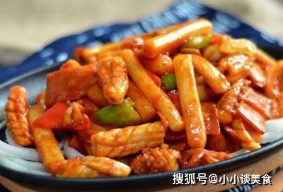 材料:魷魚、年糕、油、火腿、胡蘿卜、洋蔥、紅辣椒、青椒、韓國辣椒、醬油。