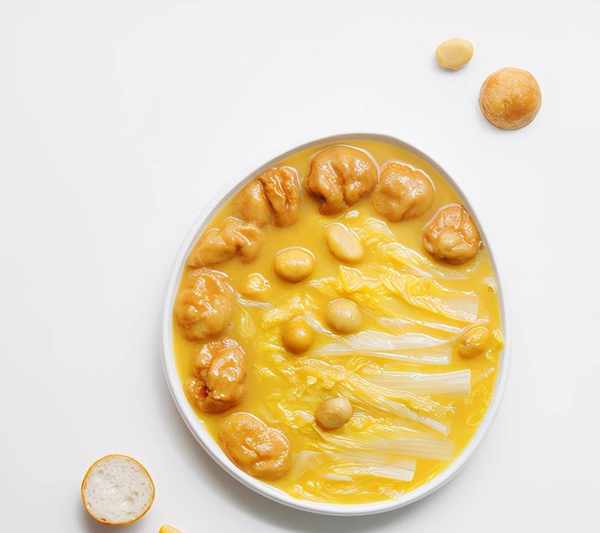 素淡也一樣好吃。我喜歡在做白菜豆腐煲時,把板栗當做主食一起煲進去。起鍋時,湯水中帶瞭清甜,栗仁也被燉得酥軟入味。這是真正的清鮮。要更考究的話,以前試過三刻的一道“濃雞湯栗子白菜煲”。是把娃娃菜先燙一下,再放進用南瓜蓉增稠過的雞湯裡,和板栗、油面筋一起燉熟。工藝略復雜,味道卻極馥鬱醇美。