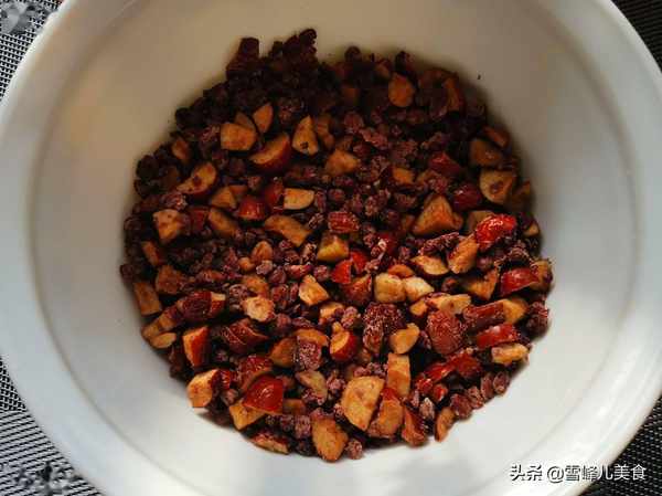 第一步:把紅棗去核剪成小顆粒,紅豆煮熟一起放到大碗裏。咱在這裡先說說紅豆吧,紅豆含有豐富的蛋白質以及鈣、磷等微量元素,是高蛋白、低熱量的一種豆類,價格不貴很受大家的歡迎。紅豆有清心養神、健脾胃等作用,而紅小豆富含的鐵質,有補血,促進血液迴圈,增强抵抗力的作用,可以說好處多多。紅棗的營養一點也不比紅豆差,俗話說"一日三顆棗,活到九十九。"充分說明了大紅棗的好處,它倆搭配營養翻倍。