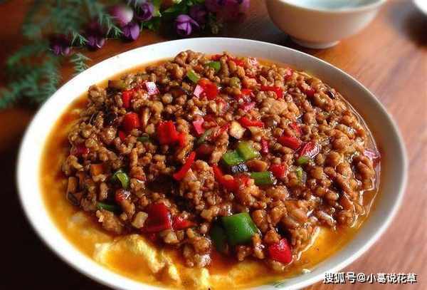 13、將肉末撒在蒸好的雞蛋豆腐上。炒至生,加入肉片炒,加鹽和雞湯調味。