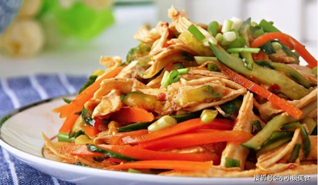 食材:雞胸肉、黃瓜、胡蘿卜、花生、香蔥、鹽、味達美、涼拌醋、白砂糖、香油、料酒、胡椒粉、大蒜