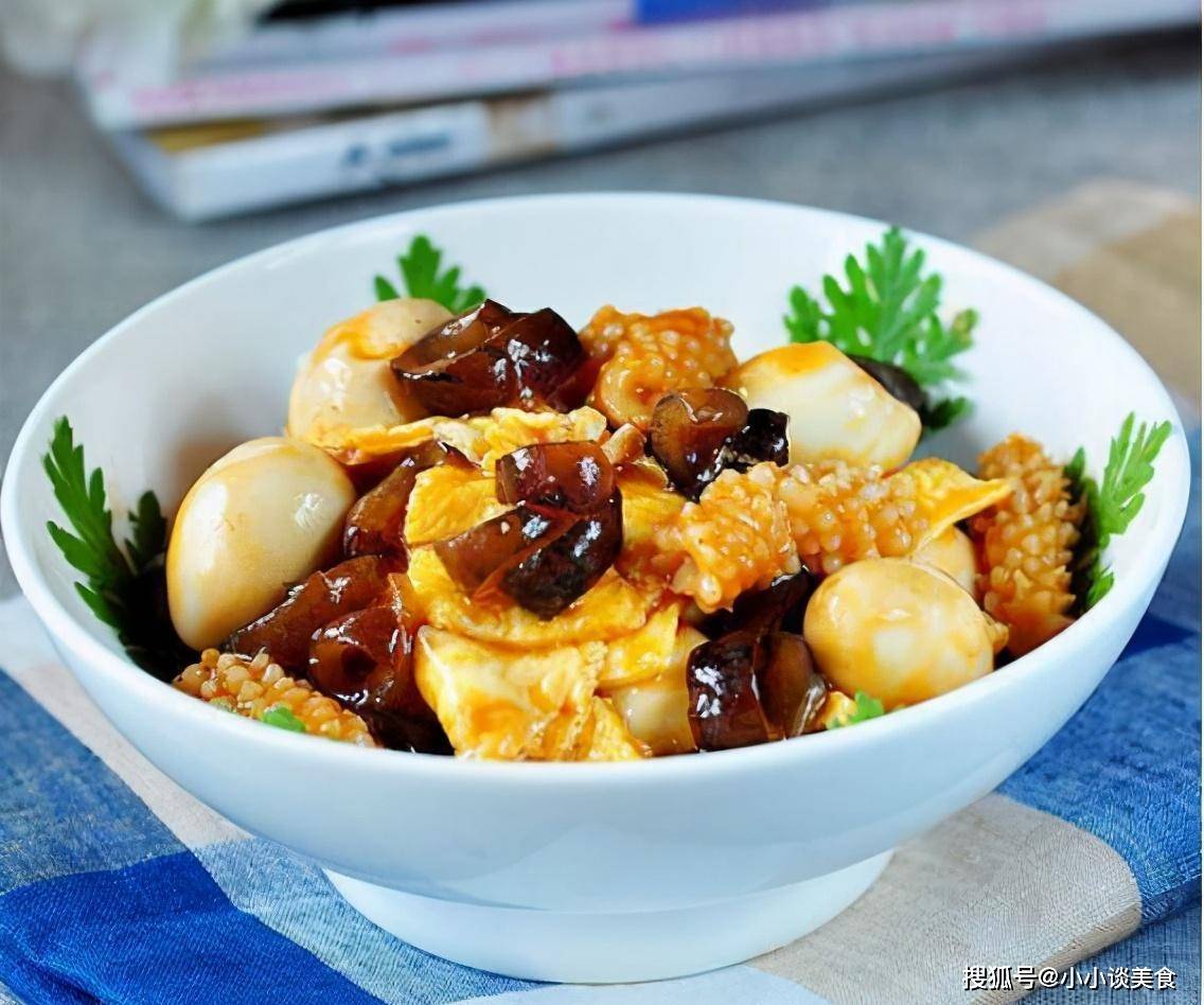 材料:水發海參3條、水發魷魚1條、鵪鶉蛋10個、雞蛋2個、薑1片、蔥1段