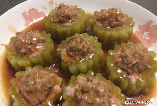 5.將焯好的苦瓜取出放入冰水中浸泡(這樣可以更好的保持苦瓜的綠色)6.將肉餡塞入苦瓜,壓緊後上鍋大火蒸十分鐘