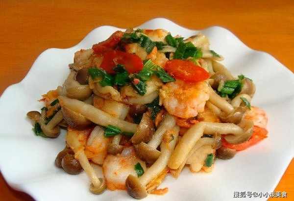 材料:蝦仁、蟹味菇、紅辣椒、青蒜、薑絲、生粉、鹽、白酒