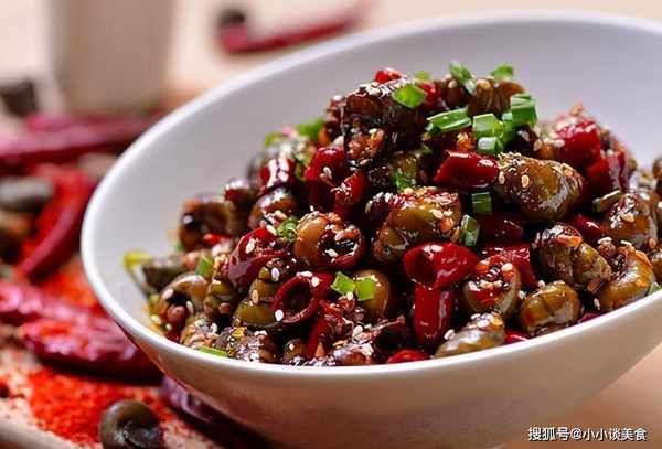 材料:田螺、幹辣椒、花椒、西洋菜、泡薑、大蒜、泡椒、植物油、料酒、味精、鹽、白糖