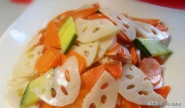 做法:1.白蓮藕去皮切薄片,用清水浸泡。將胡蘿卜去皮並切成片。