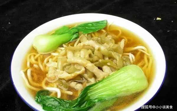 4.將調料放入面碗中,倒入面條,鋪上炸榨菜絲和豬肉,撒上蔥花。服務。