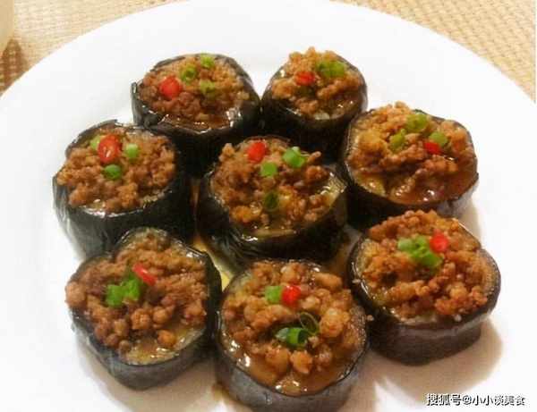 蒸好的茄子放在另一個盤子裡,肉末放在茄子外面