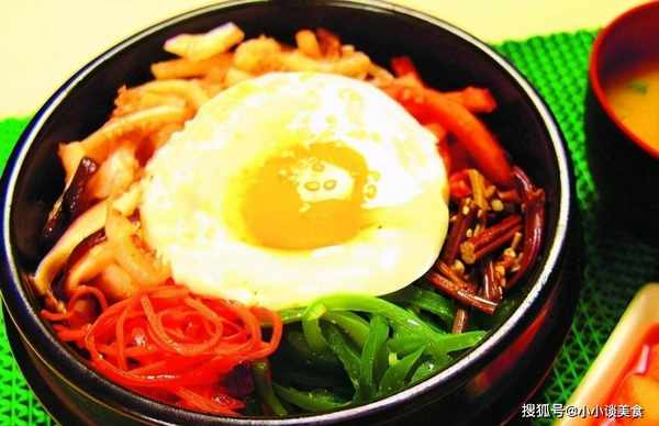 2.準備配菜的同時,淘米煮飯。將煮好的米飯放入容器中,放入不同的蔬菜,韓國辣白菜,牛肉絲和炒香菇,再煎一個太陽蛋,加入韓國辣醬和適量的香油,拌勻即可食用。