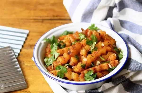 食材:土豆3個,小蔥、香菜、幹辣椒面、花椒粉、孜然粉、鹽、味精、白砂糖、醋各適量。