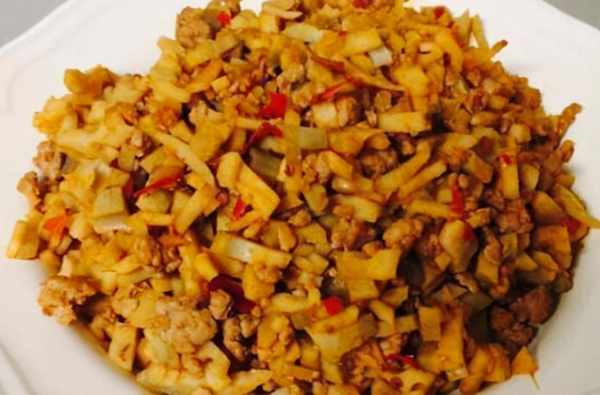 3、倒入蓮藕丁,倒掉水,再翻炒5分鐘。中間加醋。隻需在食用前加少許鹽即可。