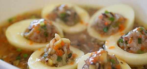 1、雞蛋洗凈,入冷水鍋煮熟。撈出去殼切兩半,取出蛋黃,留蛋白備用;豬肉餡加入鹽、蠔油、料酒、蔥末、用勺子攪拌均勻;用勺子挖出部分肉餡團成丸子,釀入雞蛋白內