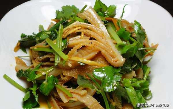 做法:1、鍋內倒入清水,大火燒開,牛肉百葉洗凈切條,加入薑片,倒入沸水中;