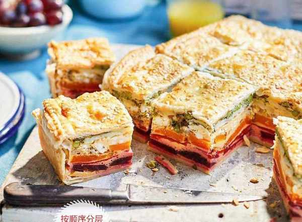 【做法】1、預熱烤箱到200度。南瓜裡加1大勺油、適量鹽拌勻,烤20分鐘到軟。這期間,用剩下的油小火煎洋蔥10到15分鐘到變成金色。煮土豆8分鐘到軟,瀝幹放涼。2、爐溫減到180度。往一個20cmX30cm的烤碗裡鋪上一張加厚烤盤紙,多留出一截等下方便脫模。將兩坨375g的酥皮摁到一塊兒,在撒瞭面佈的面板上搟到大約1元硬幣的厚度,在烤碗裡鋪好。多出的部分任其垂在烤碗外面。3、在酥皮底部撒滿面包屑,鋪上紅菜頭切片、烤辣椒、南瓜、洋蔥、菲達乳酪、土豆、豌豆和香草(按照這個順序能夠做出彩虹的視效),每層之間撒足量鹽。4、雞蛋打散,緩緩澆在內餡上,到大部分沉下去瞭,留出一點等下刷在頂上,再往周圍垂下的酥皮上刷上蛋液。將搟開的酥皮疊到頂上,用廚房用剪修整掉多餘的,留出大約2cm,搟一搟邊緣封口,用叉子緊緊摁死。刷上蛋液,撒上芝麻,用叉子劃出12塊。5、送進烤箱烤1小時20分鐘,烤到酥皮變金變脆就出爐,徹底放涼後切塊。